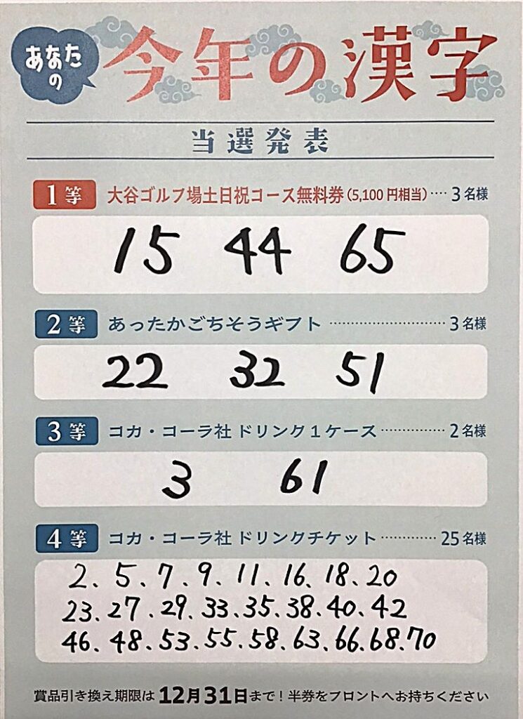 当選された方は年内12月31日(水)までに当選番号の書かれた半券をフロントまでお持ちください。賞品と交換させていただきます。