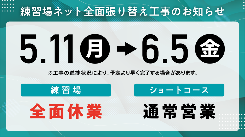 いつも大谷ゴルフ場をご利用いただき、ありがとうございます。運営の安全性向上のため、下記の通り練習場ネットリニューアル工事を行います。ご利用者様におきましてはご不便をおかけいたしますが、ご理解とご協力の程よろしくお願いいたします。